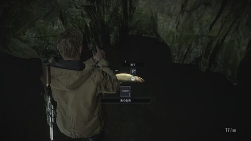 魚の生肉ゲットだぜ、回復アイテムかな? あれこれ、アンブレラマークですか、昔村ごと実験でもしたんかな? なんとこの中身ローズの頭が入ってるってさ、バラバラになっても集めたらなんとかなる言われたけど、ローズ何者って感じやね ローズのバラバラにな…